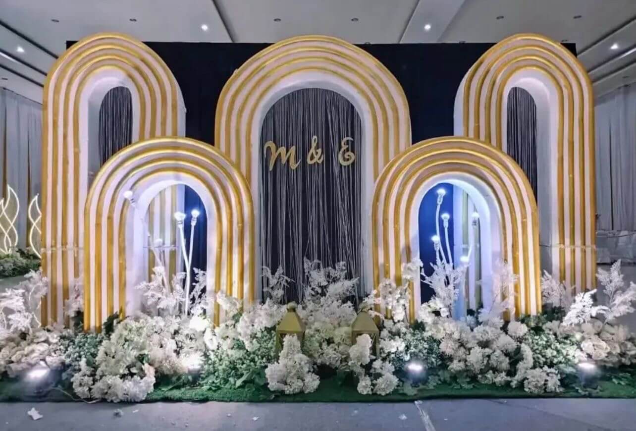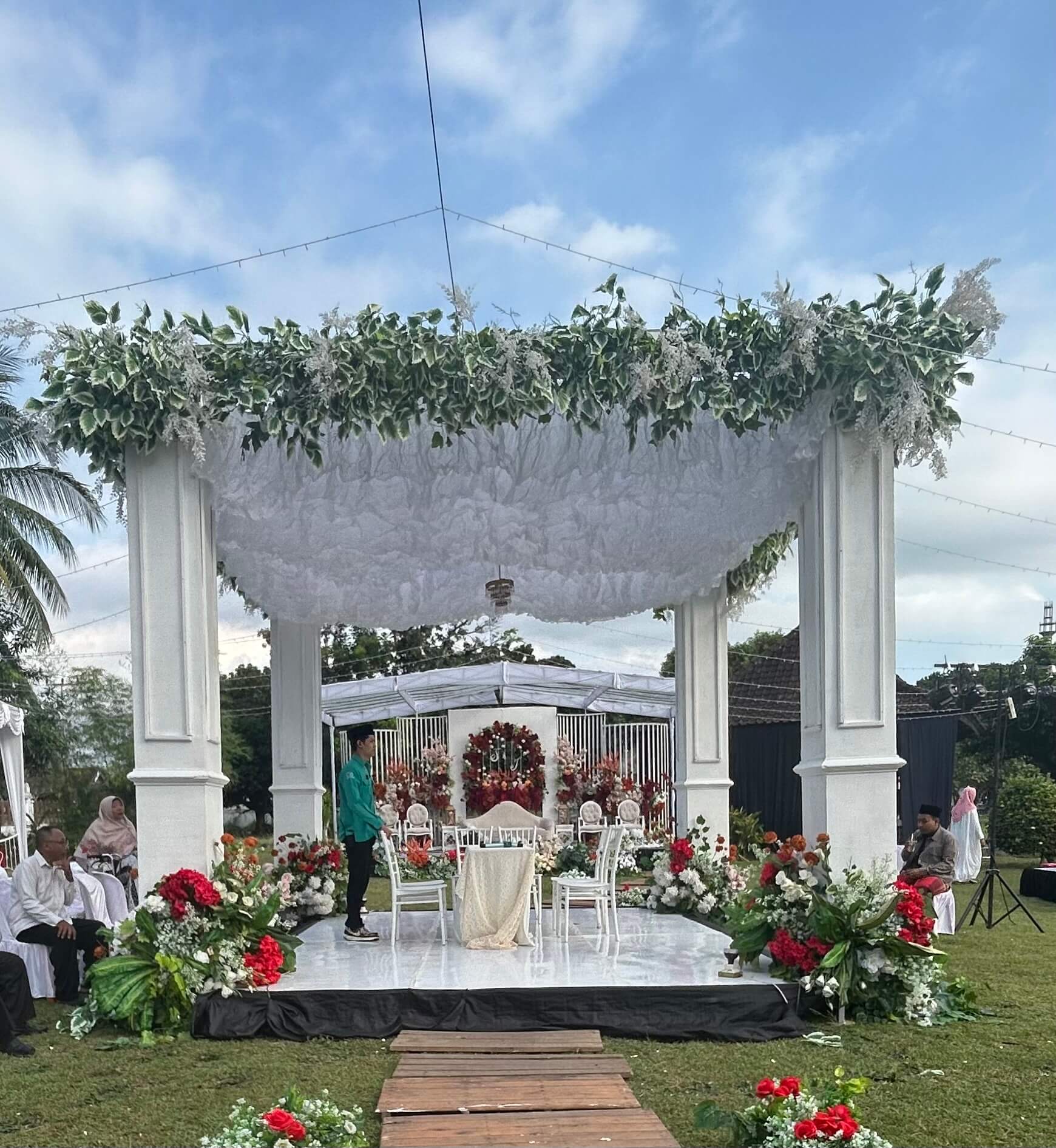 Pergola lengkap dengan Meja akad dan kursi tifani, Tema warna bunga di sesuaikan dekorasi utama